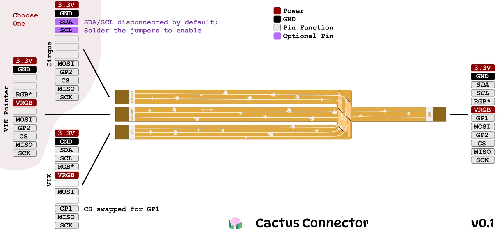 If you’re using Cirque trackpads with Lemon microcontroller, the Cactus Connector is required. The Cirque connector is very similar to VIK, but some of its pins conflict with the LED pins on VIK. The Cactus Connect has a specialized Cirque-only branch with the correct routing to avoid these conflicts.